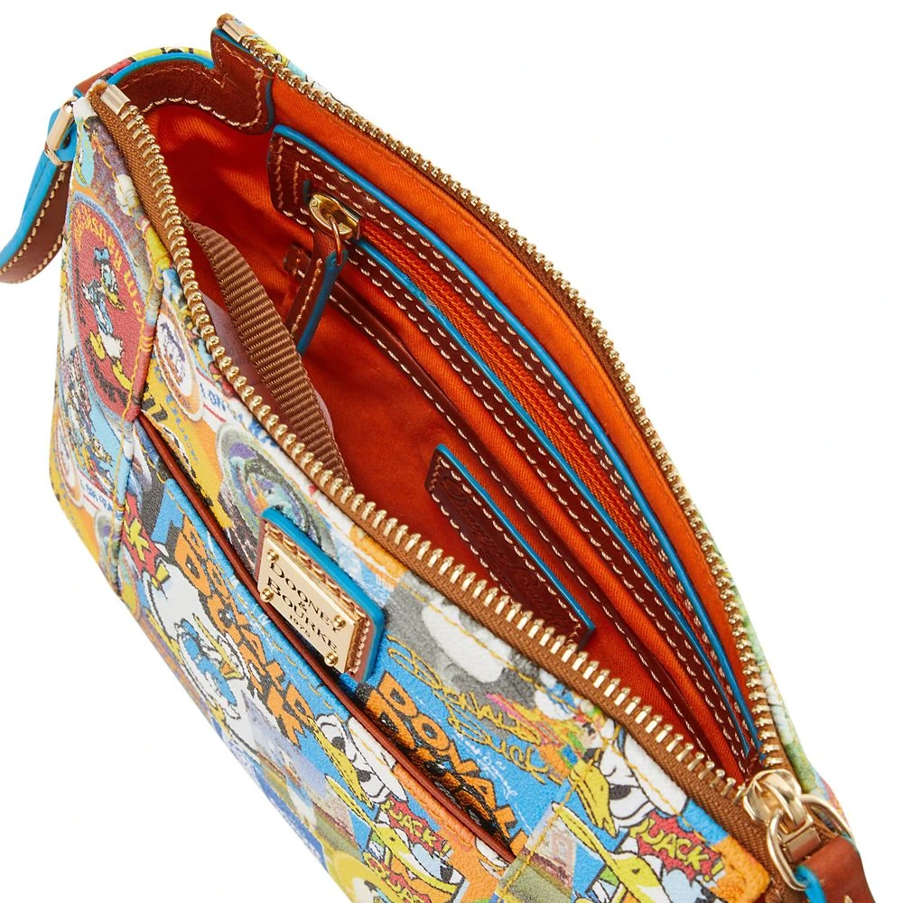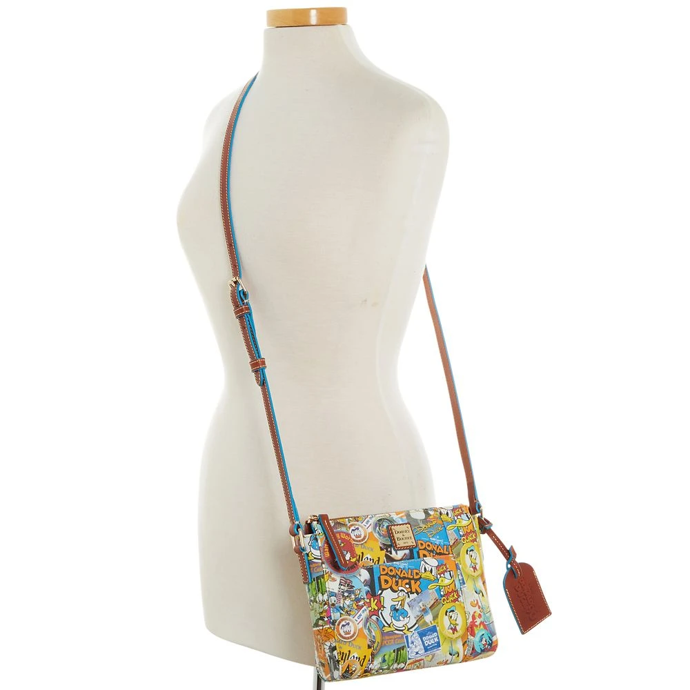 Brimming with irresistible personality, this Donald Duck Dooney & Bourke crossbody bag features an allover print of vintage-era memorabilia and poster art in celebration of Donald’s 90th anniversary. The coated cotton bag is trimmed in cowhide and has an adjustable strap plus several pockets and an attached key loop. A commemorative leather tag stamped with ”Disney Donald Duck 90” adds a special finishing touch to this once-in-a-lifetime accessory.