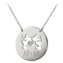 Treasure a special date or make your initials official with your sweetie on this elegant sterling silver necklace featuring a cutout design of everyone’s beloved couple. Mickey and Minnie are joined by a studded heart above an engraving of your choice.
