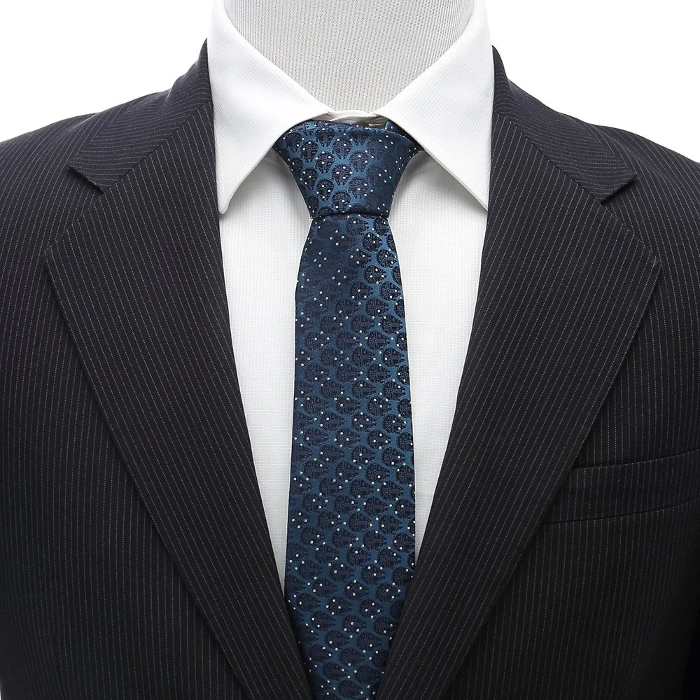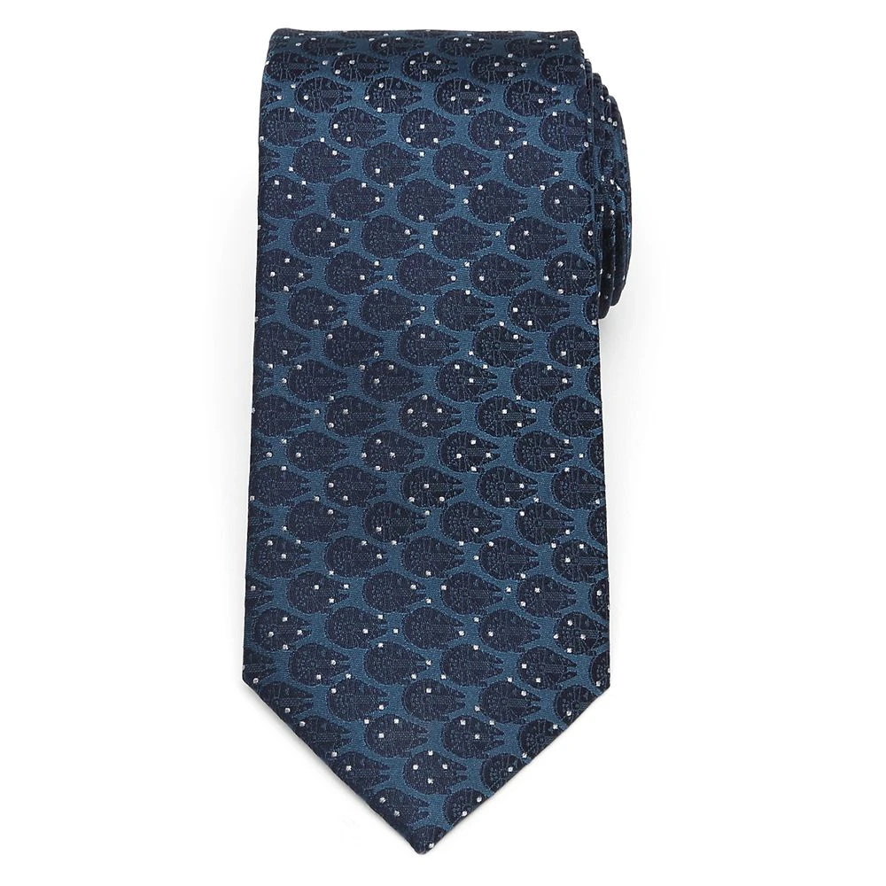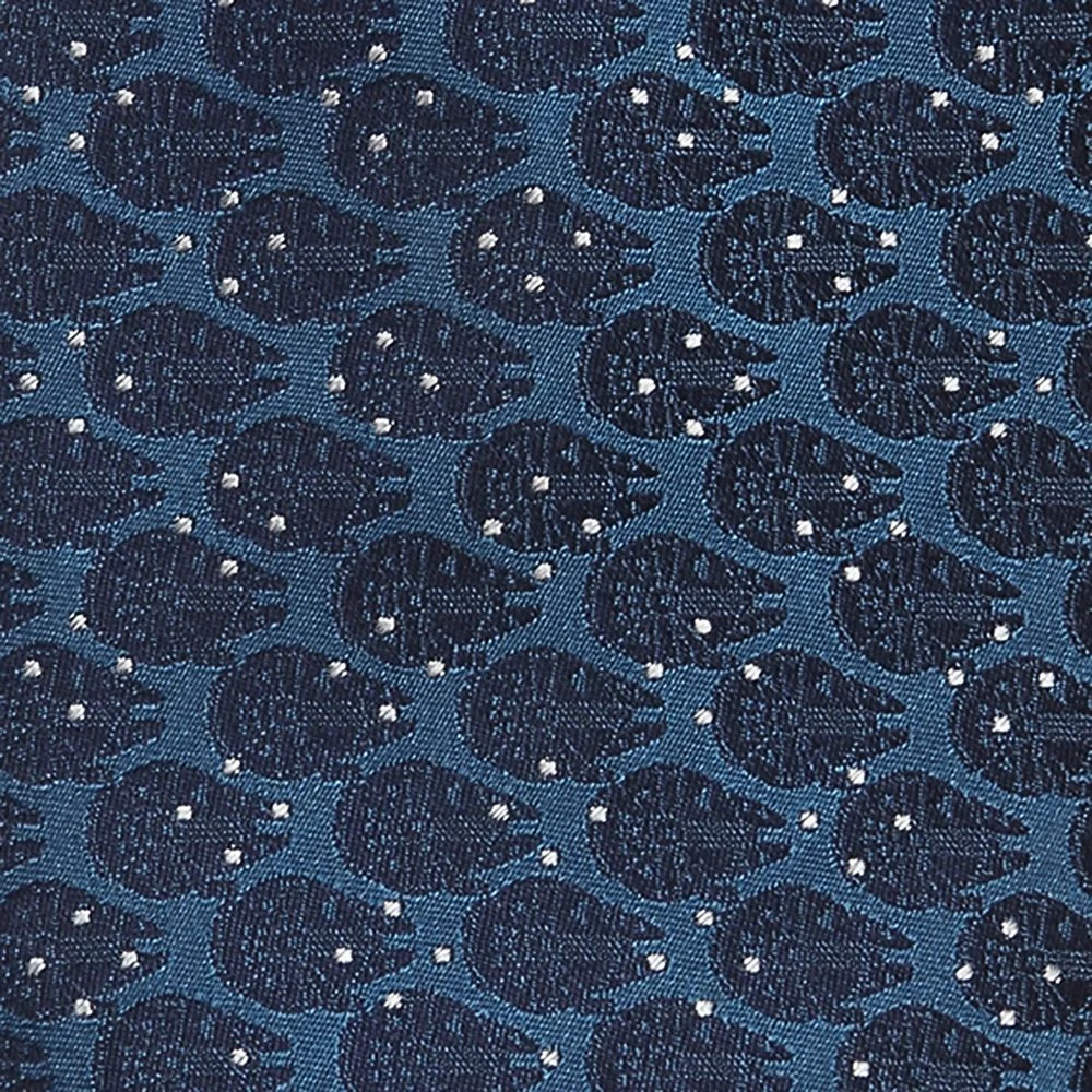 Teal and electric blue threads combine to form this elegant 100% silk tie. The Millennium Falcon darts across in neat rows, covered in a series of tiny silver dots reminiscent of all the stars in a galaxy far, far away.