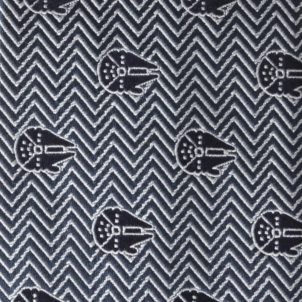 ”Fly casual,” but dress formal with this stylish black and grey herringbone tie featuring the fastest hunk of junk in the galaxy. Made with 100% silk, this Millennium Falcon tie is a must for Star Wars fans.